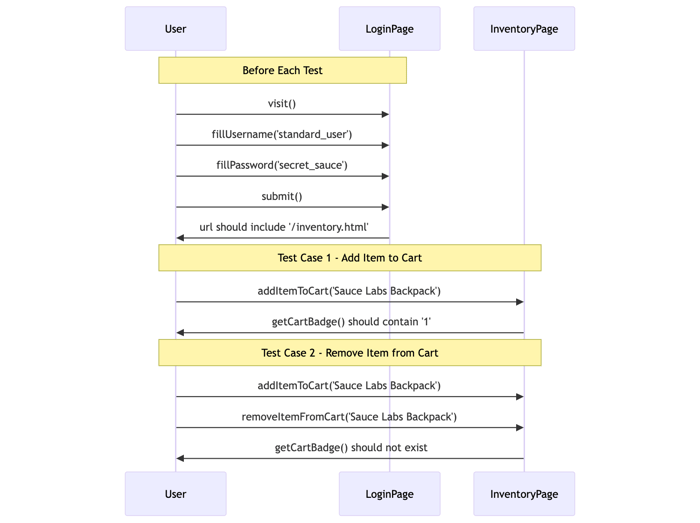 The resulting diagram effectively represents the sequences, showing which entities interact at each stage—for example, the user interacts with the inventory page (addItemToCart), and later the inventory page confirms that the item was added to the cart (getCartBadge):