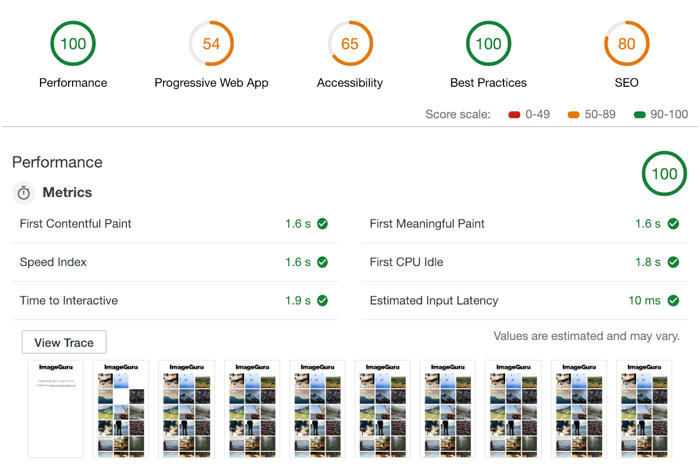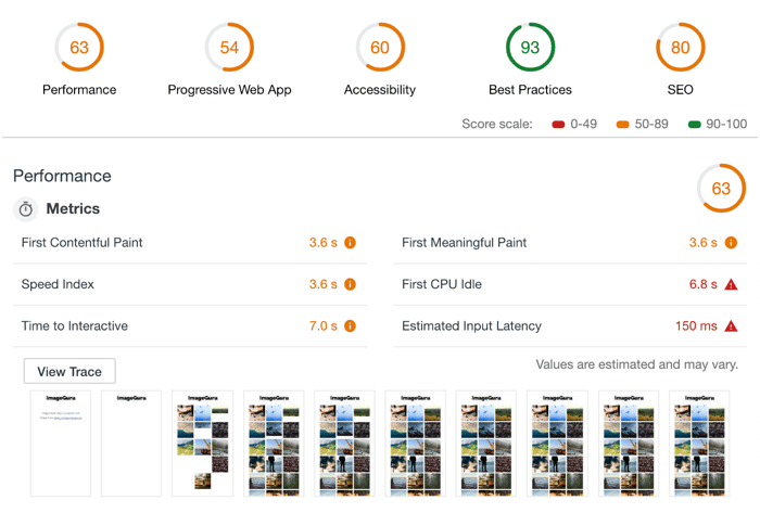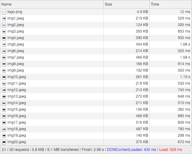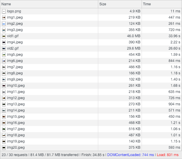 Suppose you were developing an app yourself. And it would be let’s say… an instagram for stock photography professionals. I don’t know why you would do this but let’s imagine. You have spent some time on it, you even came up with a name – ImageGuru. But it isn’t performing well enough. It’s not as high in Google ranking as you would hope it to be and a lot of people are leaving the page before it even loaded! You are devastated but would like to check why it is so. You open the devtools, reload the page and see this… 82 MB of data downloaded and it in the end took more than 30s to load everything. Oh shoot… Gotta do something with it then.