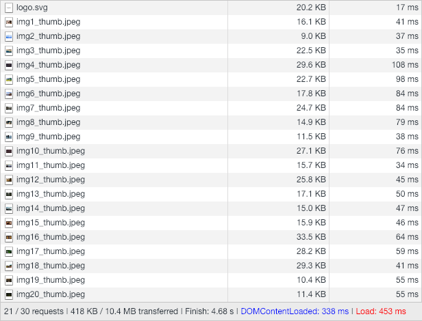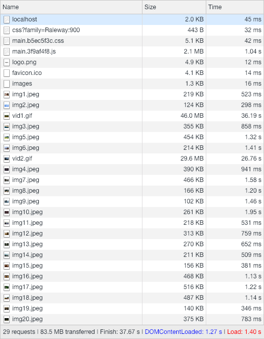 Then we can move on to the rest of the assets. First thing that we should take a look at are the image sizes. Both images on thumbnails and in details view are exactly the same, so the size of them is 1920x1080 to look good when they are stretched to cover full length of the screen on desktop. Most of the time, however, all of those pixels won’t be used as nowadays more than a half of the internet traffic is from mobile devices. So what we can do, is to change the resolution of each image. To do this you could use cli tool like node-thumbnail cli or a webpack plugin (like thumbnail-webpack-plugin that relies on previous tool).