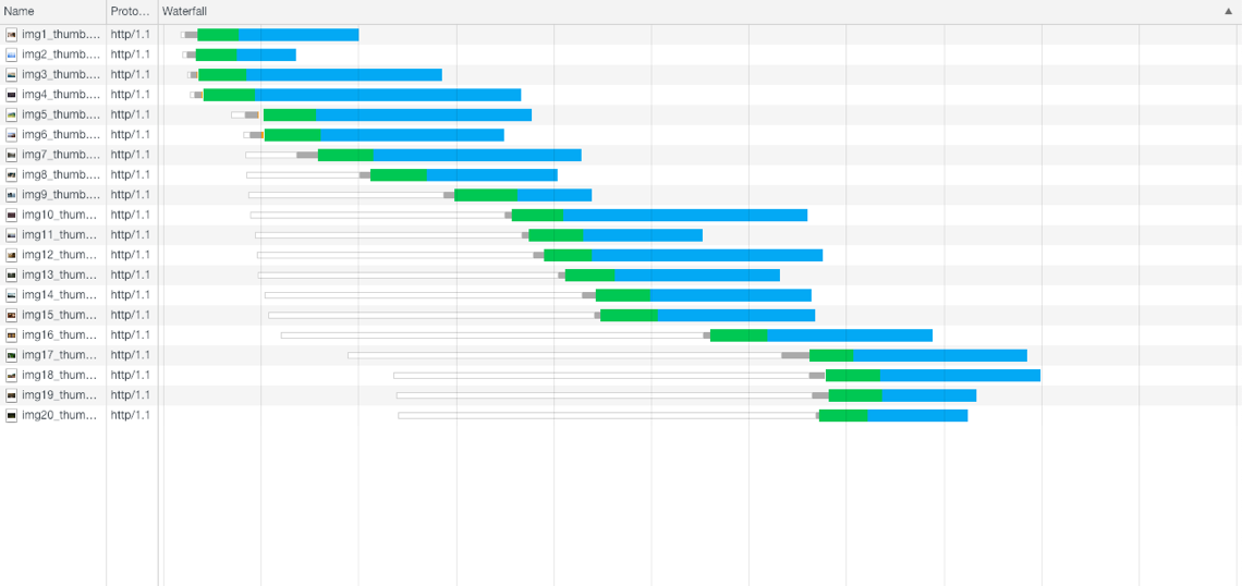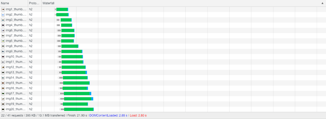 As you can see all of the data now is being downloaded almost at once, concurrently. With HTTP/1.1 we had to wait for previous file to finish downloading before the next one would start.
