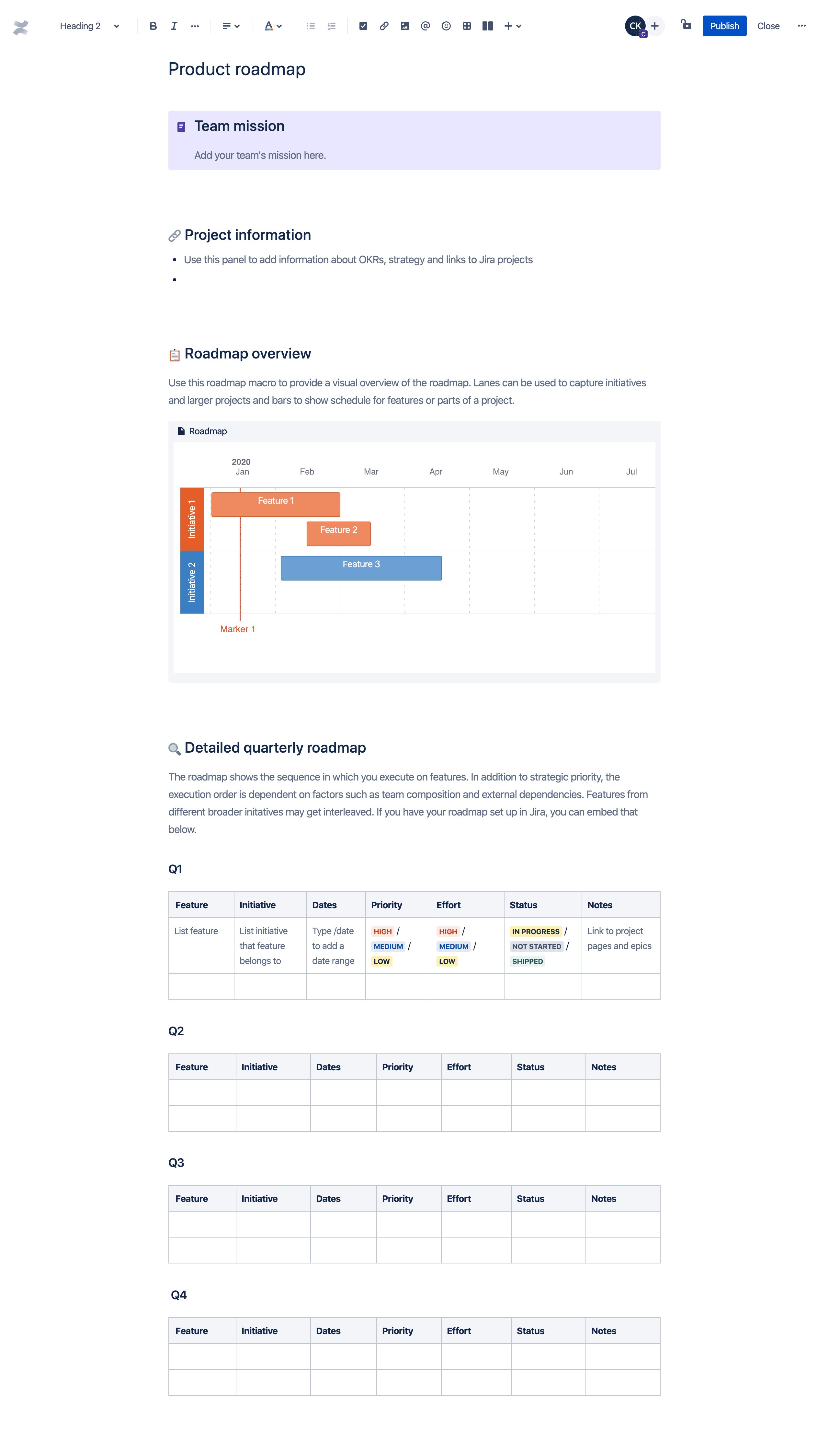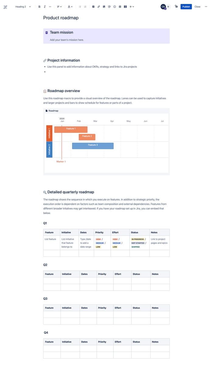 We heavily utilize Confluence at Netguru as a knowledge base and internal communication tool. But it is also possible to create a roadmap within Confluence using a product roadmap template.