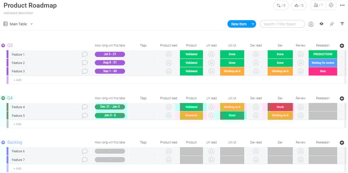 Monday.com is a funky tool for project and product management. You can create roadmaps based on the templates provided, which you can freely customize and use. They offer everything that you need from a good product roadmap.