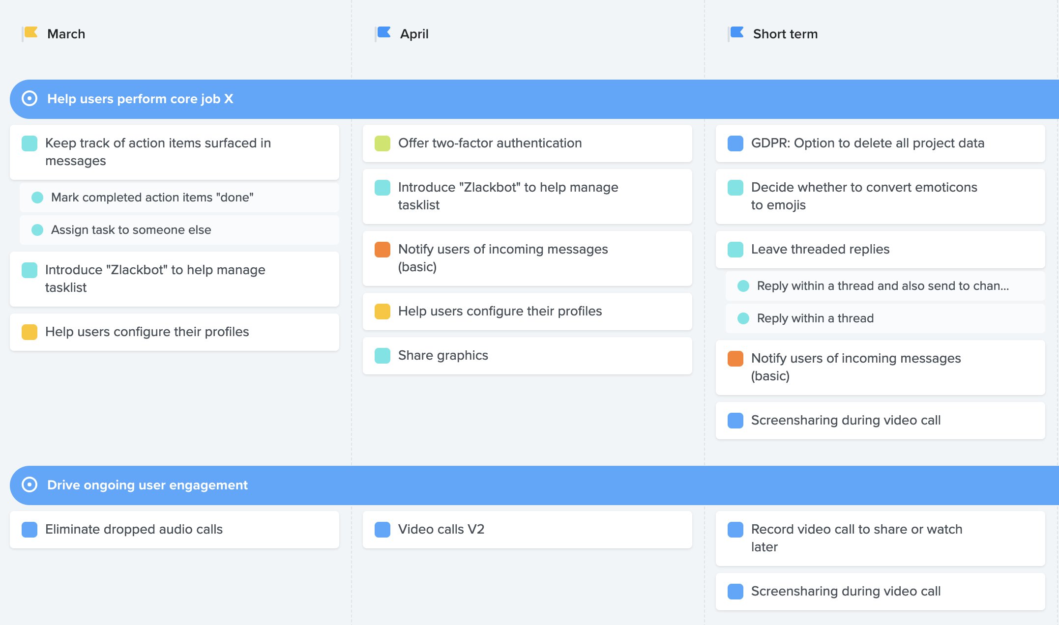 This type of roadmap communicates your priorities over broad time frames. However, there’s an emphasis on the near-term. Features in the “now” section gather more detail as you work on them, while features in the “later” part of the roadmap are more high-level, reflecting long-term strategy.