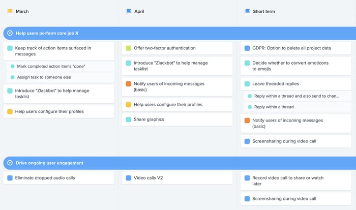 Column roadmaps group components according to color-coded bars or columns. That gives an at-a-glance view of what’s going on with the product.