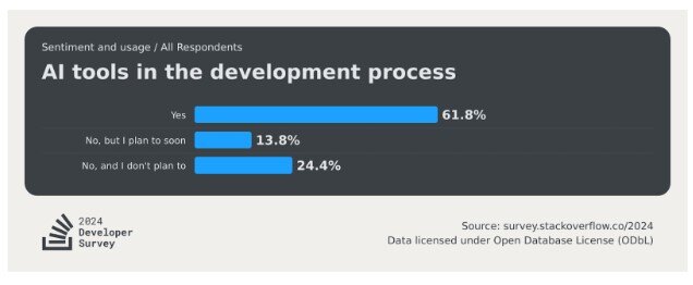 Coding support: AI in software development is another incredibly powerful – and popular – business use case. According to Stack Overflow, 76% of software engineers say that they use AI assistants in their work, and 72% are happy with the output. These assistants can automate many repetitive tasks for software developers and boost their efficiency. Among others, these AI tools can help with code generation, debugging existing code, and running analyses to predict potential issues in datasets.