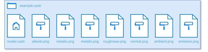 - USDZ bundles all models and textures into a single file for efficient delivery of 3D content without having to work with reference files.