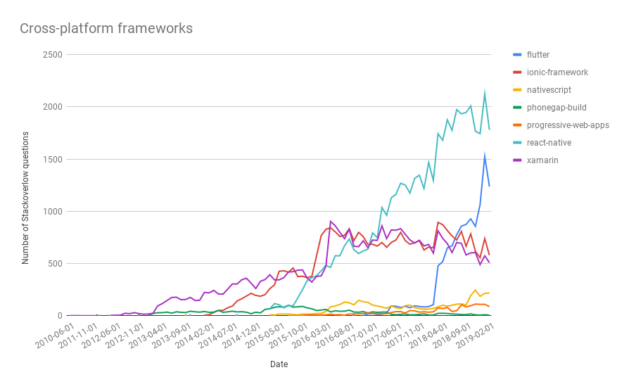 NativeScript was first released in 2015. This cross-platform mobile development platform is based on Angular combined with TypeScript or JavaScript. It’s slower and less popular than React Native, resulting in a low number of third-party libraries and a diminutive community. Its one major benefit is access to native device features, but this is also offered in other, more popular frameworks.