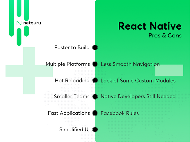Other examples of successful RN apps include Facebook, Shine, and Uber Eats. React Native is not a good choice if you’re planning a low-level, computation-heavy app (for instance, an application that does a lot of visual processing).