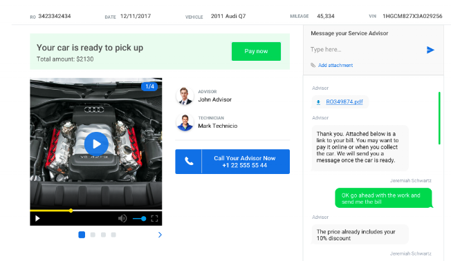 Using Quik Video, technicians shoot a quick (hence the name) explanatory video tour: what is wrong with the car, which parts need fixing. The clip is a brief (up to 4 minutes, average just over 1 minute) uncut shot starting and ending with the car’s licence plate. Technicians are trained to use non-technical language. The customer gets a link to their video in an email and a text message. As soon as the customer watches the video, the service advisor is immediately notified and can follow up with a phone call.