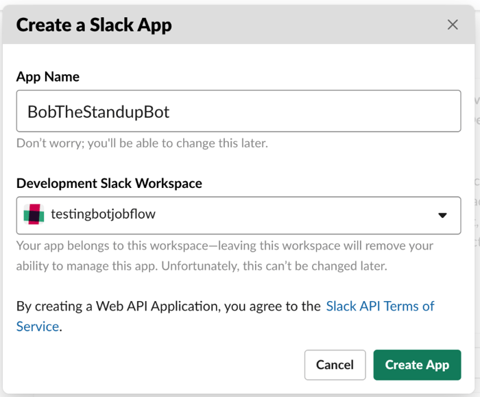 Now we can register our bot in the Slack namespace so the app will know where to send all the notifications. To do this, go to https://api.slack.com/apps?new_app=1 and fill in the app name and select a workspace.
