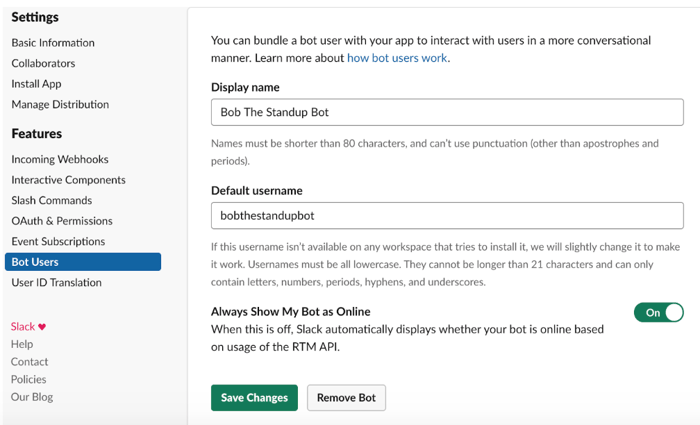 Then go the Bot Users page under the Features section of your newly created bot and create a new one. This will create a Slack-user-like object which will be later listed on your Slack users list.