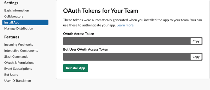 Last but not least, click on Install App on the Install App page. This will ask for your permission to authorize access for the bot to your workspace. As a result, you will receive an OAuth Access Token and a Bot User OAuth Access Token. These are very important as they allow your Python code to communicate with Slack.