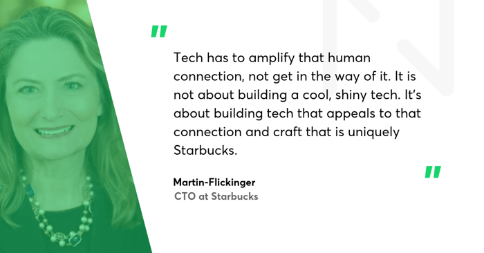 "Starbucks is an experience. And it’s centered around that customer connection in the store, the human connection, one person, one cup, one neighborhood at a time. I think that mission is so critical to how technology has to show up for us. Tech has to amplify that human connection, not get in the way of it. It is not about building cool, shiny tech. It’s about building tech that appeals to that connection and craft that is uniquely Starbucks" - said Gerri Martin-Flickinger, Starbucks CTO.