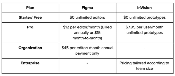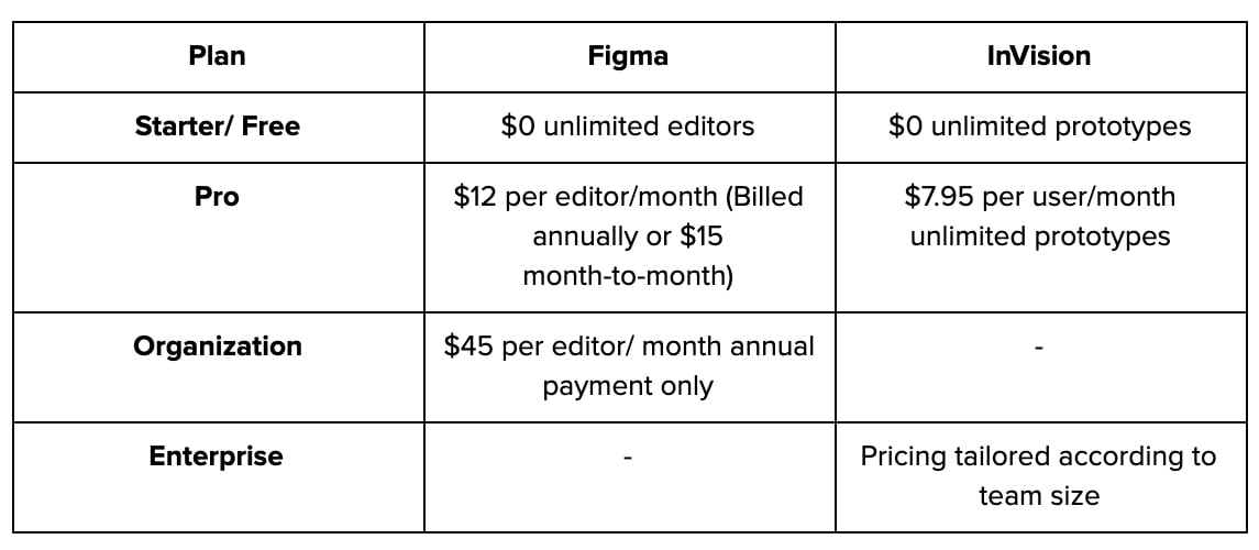 The table below presents the pricing for both tools and you can easily notice the difference in focus for each tool: Figma charges per editor while InVision focuses on the number of prototypes first, making the number of editors a secondary factor.