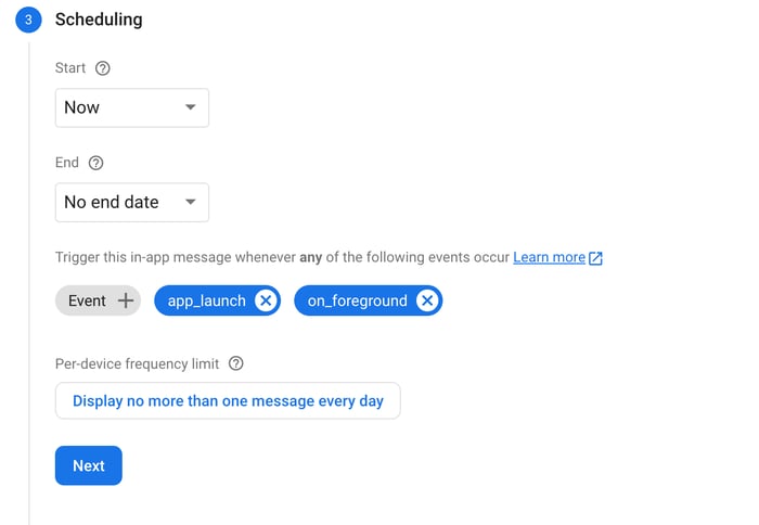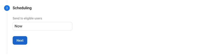 The third and most important step is scheduling. Here you have to provide a timeframe in which messages will be sent to users. You also have to choose events which will trigger messages. The last thing you can do in this step is choose a sending frequency.