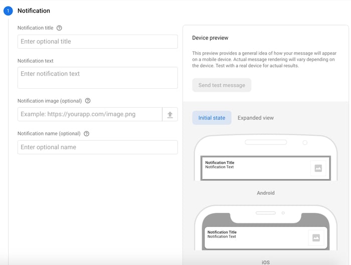 First, you have to provide a notification title and a notification text. A notification image is optional and requires upgrading to the Blaze plan. A notification name is also optional, but you can provide one without upgrading to the Blaze plan.