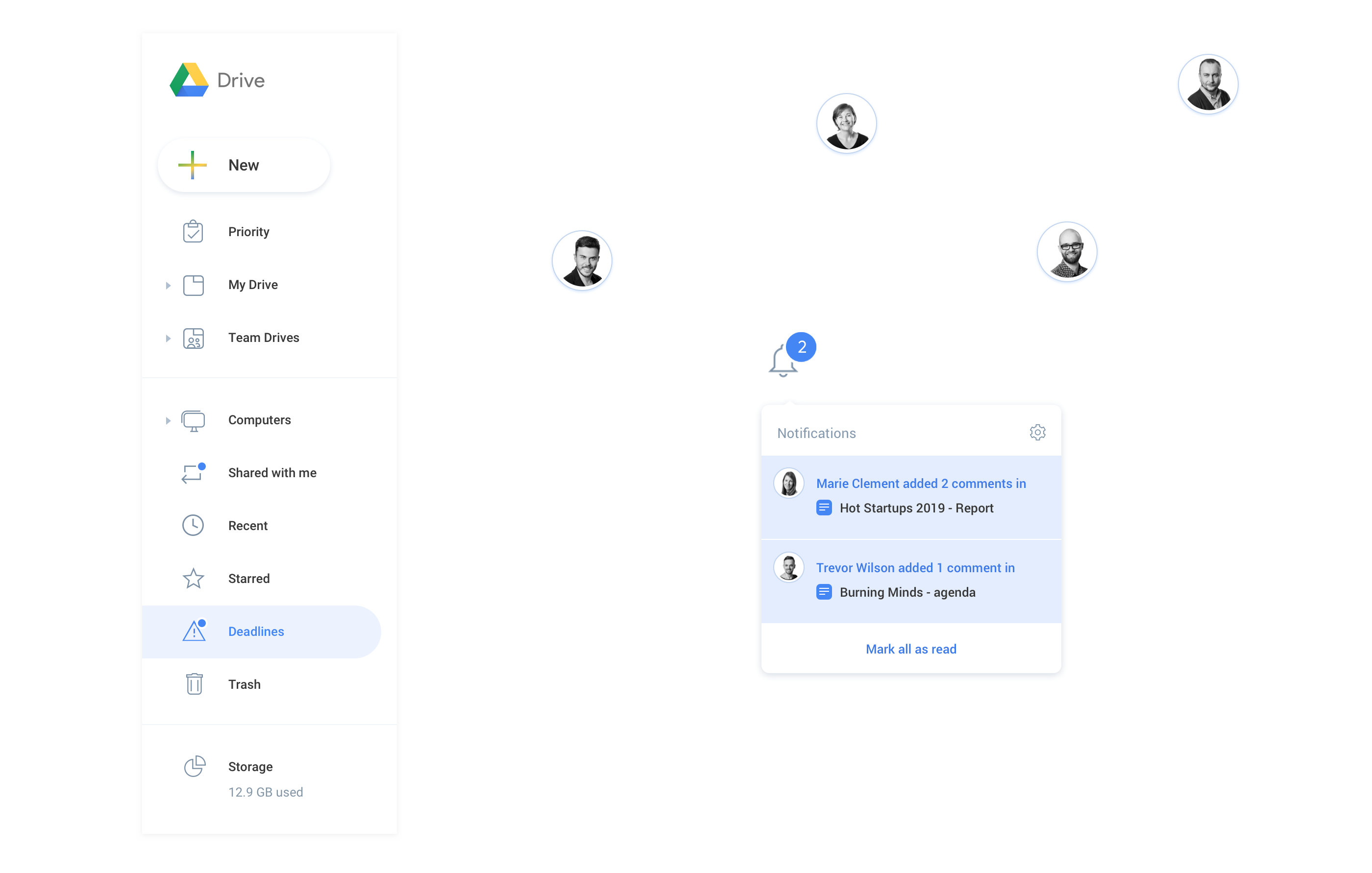 When it comes to the dashboard, it now offers an option to drag & drop elements to Quick Access. Upon hovering over a document, users can now see the document’s location and recent comments and suggestions added in the document. Notifications are now embedded in Google Drive, and they will notify users about newly shared documents and replies to their comments. Finally, we created a Deadlines tab that sorts documents by a deadline and shows which ones should be worked on first.