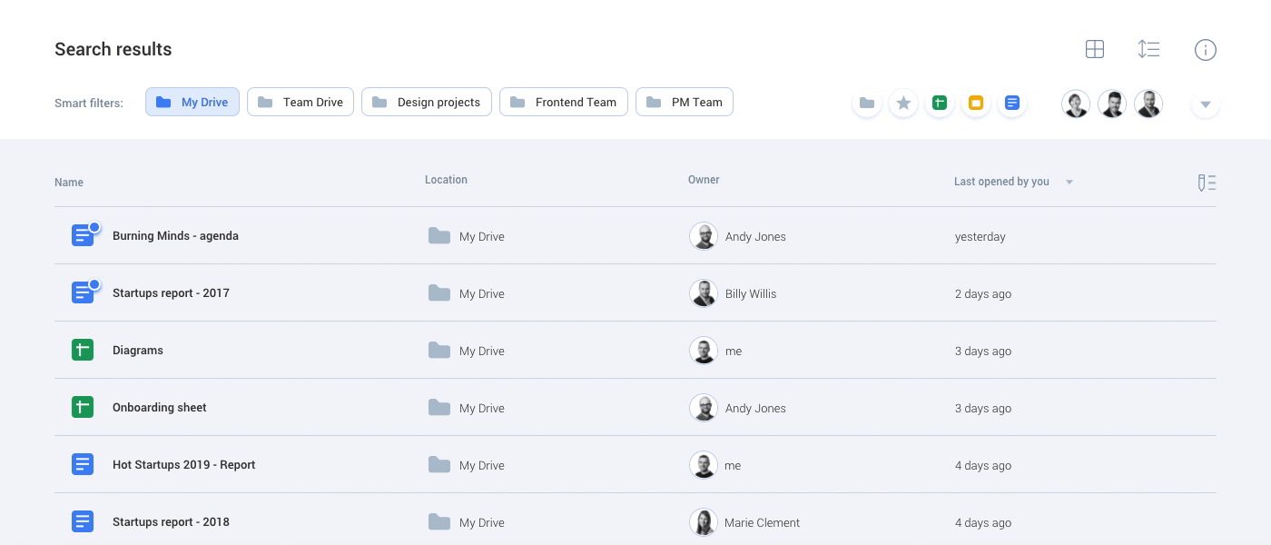 Our respondents did not realize that the filters feature was available directly by clicking the chevron in the search bar. In our redesign, filters are shown directly above the search results. Users can now locate files and folders quickly by browsing documents according to different Team Drives, types of files, owners, etc. No more complicated search patterns – the elements are filtered instantly!