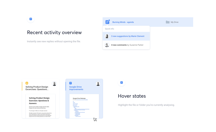 Our colleagues often receive notifications via Slack or email about new replies, comments, and suggestions on Google Drive. We thought it would be great to see this information directly in Google Drive as well. A user could just hover over and check new notifications without the need for opening the document at all!