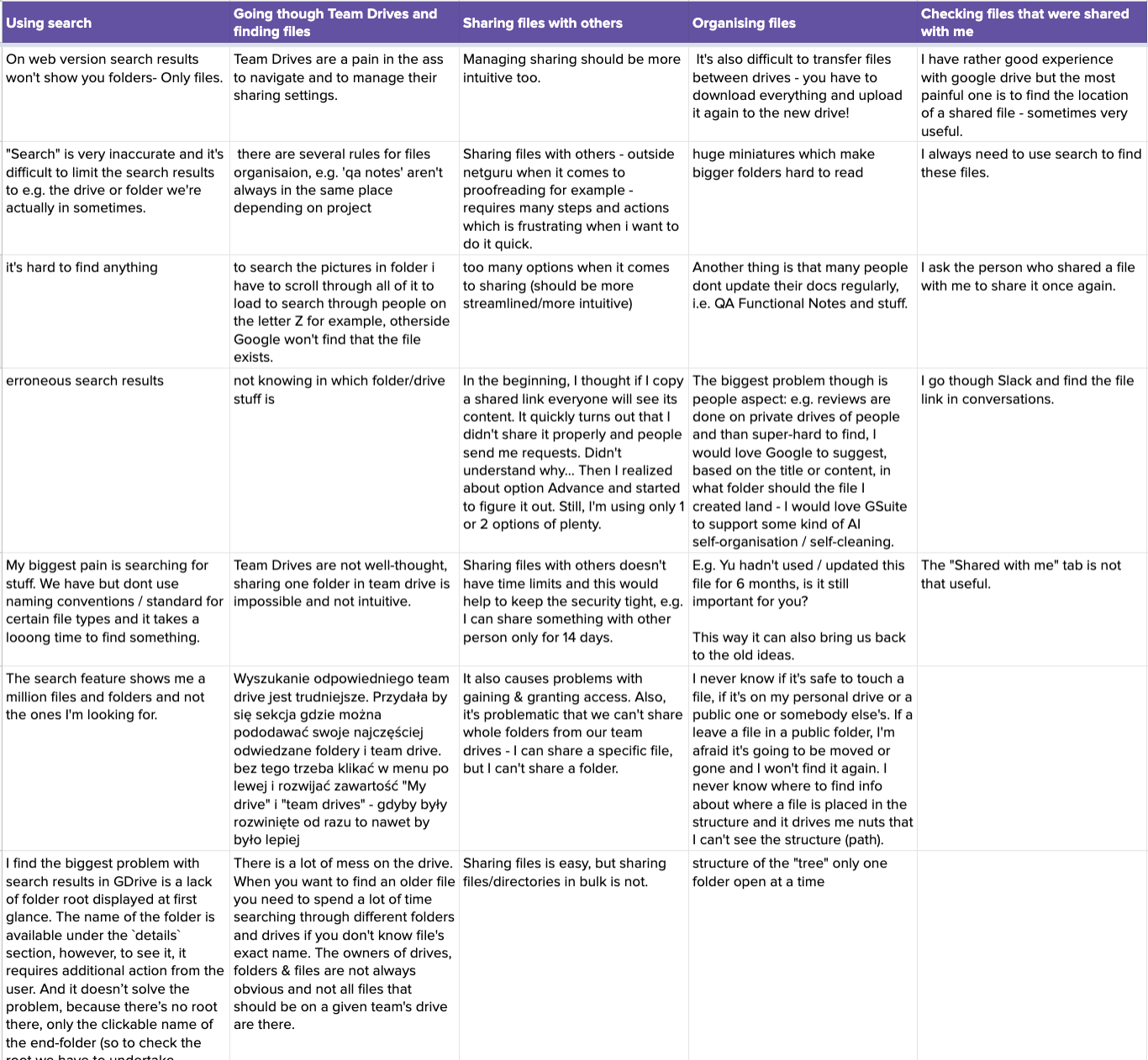 When it comes to the argumentation and explanation of why those features were painful, we gathered insights from an open-ended question – our colleagues were free to complain and describe the most painful situations when using GDrive interface. The question that enabled us to understand the recurring frustration with using Google Drive, was: “Could you explain why you find those features painful?”. The raw data was analyzed and grouped together in order to identify popular difficulties.