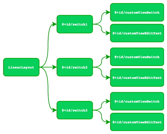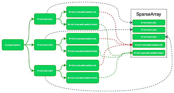 As you can see, the tags @+id/customViewSwitch and @+id/customViewEditText and are repeated, so the generated sparse array saves the children of @+id/switch1, then @+id/switch2, and finally @+id/switch3.