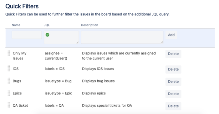 One of the great features is having quick filters, which helps us sift through the tickets in order to find the ones that we want to work on in the next sprint. These filters can be highly customizable and we can choose to filter by assignee, any label we enter (some most popular are of course labels describing backend, frontend, mobile or the name of the technology), and many other things.