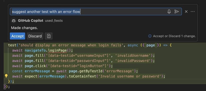 This time, we didn't specify what the flow should check exactly, which is why GitHub Copilot generated the most common scenario with invalid data. It repeated the steps that we used for the happy flow and added failing data with an error message. What's interesting, is that these were not yet present in the source code, so GitHub Copilot made them up.