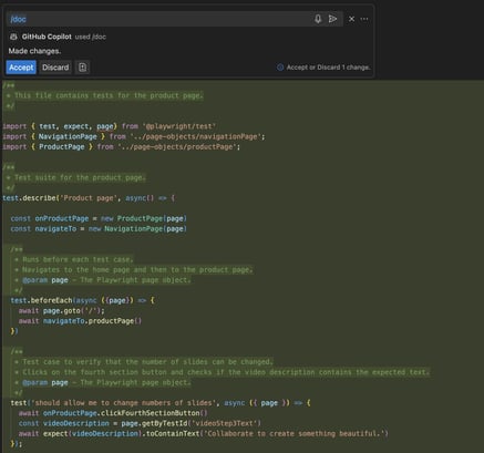 When in need of creating documentation for the code, select the code snippet and use the /doc command. GitHub Copilot Chat will then generate a documentation comment for your code.