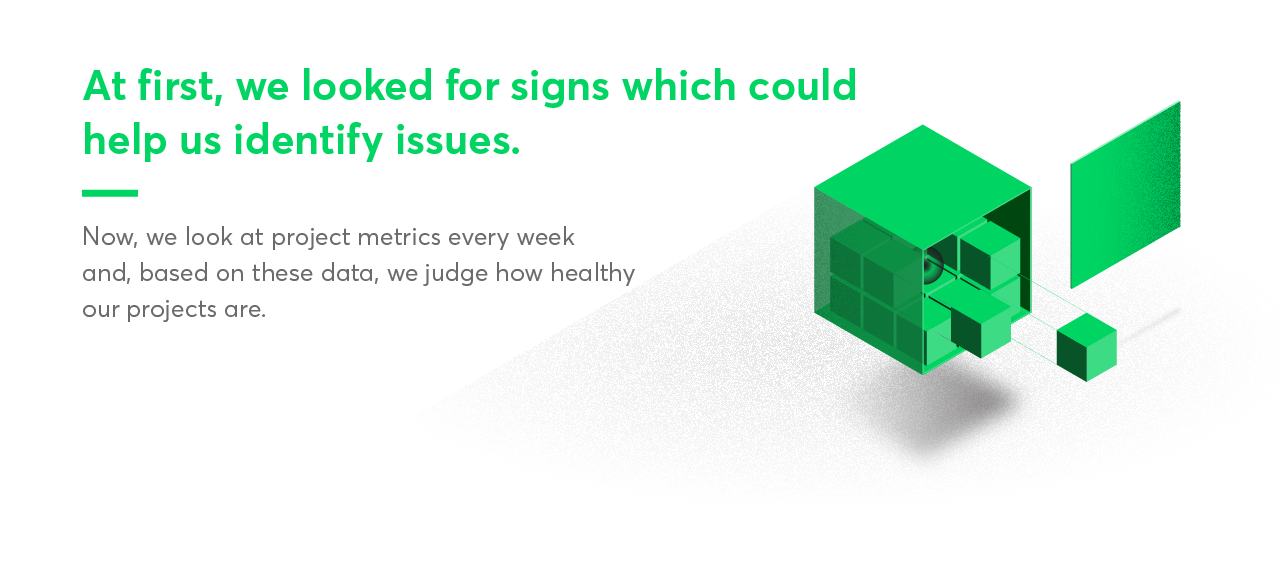 We began searching for metrics which would help us measure how a given project is doing. We started by having a few meetings with the whole project team. We broke projects into segments and checked whether we could see issues in any of those segments. It wasn’t a simple matter, since we always have quite a few concurrent projects on our hands.