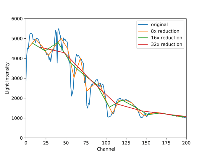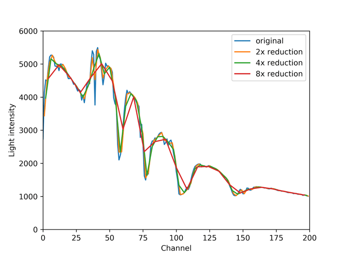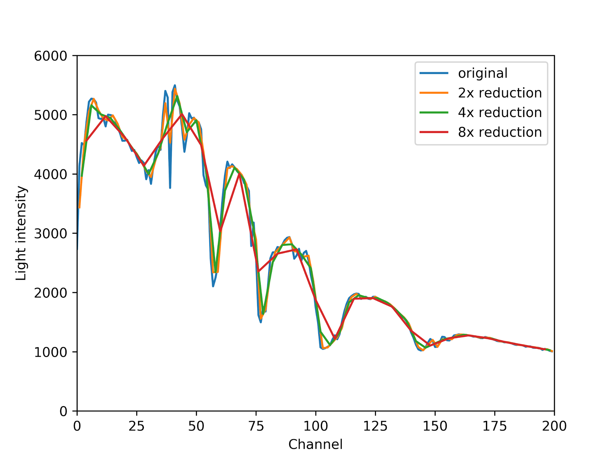 Looking at the spectra, we realized that adjacent channels have almost the same values, meaning they carry redundant information. We decided to evaluate how dropping every other channel would impact the performance of a machine learning classifier. It turned out that a reduction of 50% of channels, meaning 50% if the size of the data, has a negligible effect on the final accuracy of three popular ML classifiers. We decided to continue with such reduction (actually we exploited three different methods of such data reduction - taking an average of a few adjacent channels, taking the channel with the highest signal to noise ratio, and selecting one channel randomly in a given window. They all gave similar results) for larger factors. The image below shows how the spectra of the same pixel change if we apply 2x, 4x, and 8x reduction of the data, as well as the original spectrum for comparison. We can see that the 2x reduction changes virtually nothing. The 4x reduction has some edges here and there, but generally follows the trend of the original data. Only at 8x reduction we start to see some degradation of the spectrum, something that even smart interpolation cannot revert.