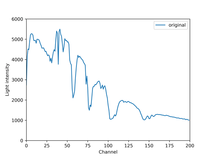 NASA is in possession of a well-known hyperspectral sensor called the Airborne Visible/Infrared Imaging Spectrometer, or AVIRIS for short. It takes images in as many as 224 separate channels. An example spectrum of a pixel of hyperspectral image taken by AVIRIS is presented below. The pixel represents a land area covered with soybean crops. There are only 200 channels present, since some were already removed due to the strong water absorption mentioned above. There are more relatively broad and weaker water absorption bands visible, detected in channels close to 60, 80, and 100.