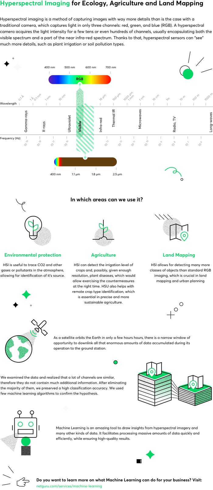 In a recent post we highlighted some valuable applications of hyperspectral imaging in agriculture and environmental protection. So how come that such a useful technology is not commonly applied worldwide? There are multiple obstacles preventing that from happening, such as the high cost of satellites and hyperspectral technologies, lack of a common standard for manufacturing of hyperspectral sensors, insufficient labeled data for training, and the high volume of produced data. In this post I’ll focus on the last issue - I will describe what is it all about and what are we doing to tackle it.
