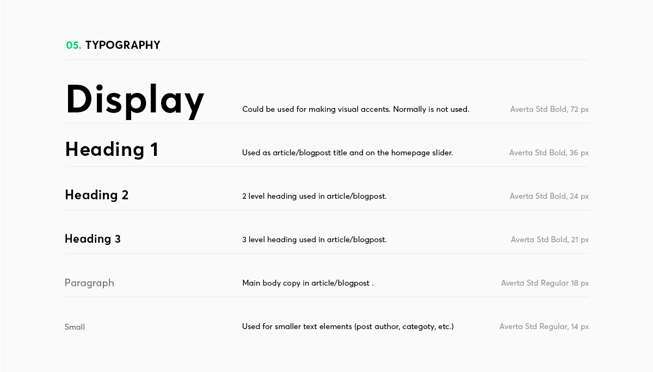 Most applications are about consuming and sending data, mostly text data, so it’s pretty important to include the information about used typography. The best way to present such information would not only include the visual aspects such as colors, font-weights, and line-heights, but also the context that a particular font style should be used in, the Typography section from Netguru’s style guide for netguru.co is a perfect example of this: