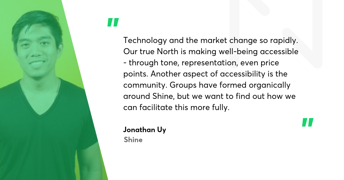 Hard to say. Technology and the market change so rapidly. Our true North is making well-being accessible - through tone, representation, even price points. Another aspect of accessibility is the community. Groups have formed organically around Shine, but we want to find out how we can facilitate this more fully.