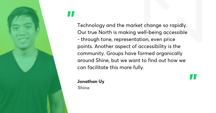 All members of the founding team worked together previously at the nonprofit DoSomething.org. It was a very formative time, a time of recognising how technology can have a positive impact on daily life. That conviction got embedded in our DNA. We have people working on Shine who trained to be life coaches or worked on personal projects which helped their friends through various issues. There is a lot of passion for wellbeing at Shine, but mostly we just try to be people who care about others.