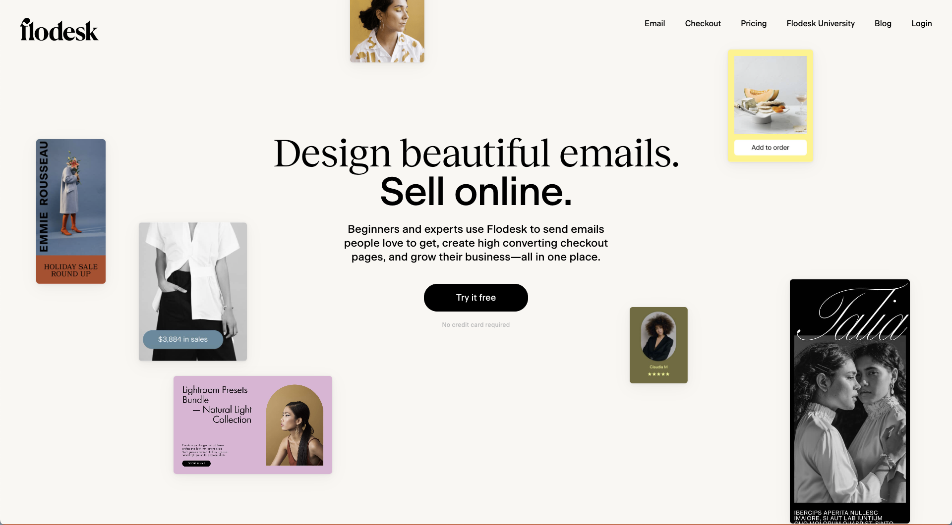 Flodesk landing page has a very inspirational design with a unique layout, bold colors, and interesting UI, encouraging the visitors to scroll. The visuals used on top are also examples of what the customer can achieve by using their service.