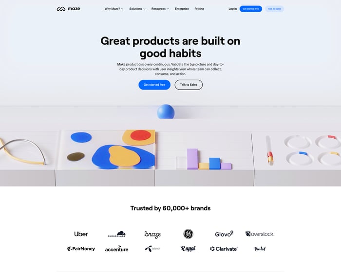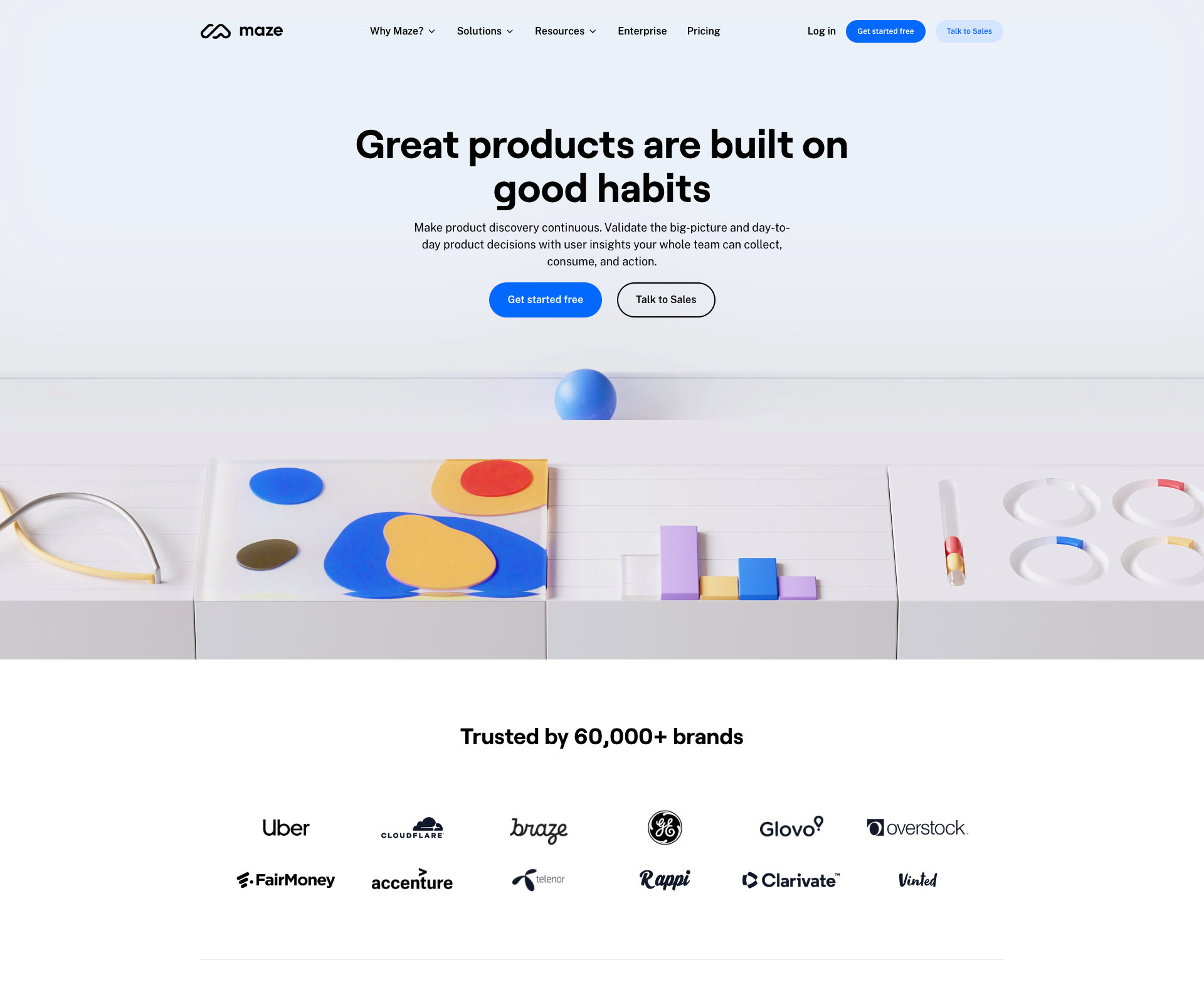 Maze’s landing page consists of bold, amazingly animated 3D visuals that catch the user’s eye. They provide a very straightforward CTA, encouraging visitors to try their service for free. They’ve added a social proof with the number of customers and reinforced the most important values and features of their offer.