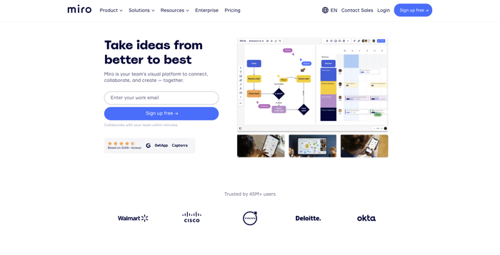 One of our favorite examples of well-implemented social proof is the one used by Miro. The company uses three different types of social proof above the fold: