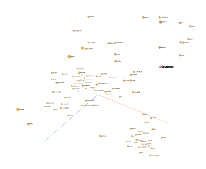 The picture displays a graphical representation of words in which certain groups of them are distinguishable, such as the word "drummer" being linked to music-related subjects. Additionally, there is a group of names located at the bottom and a collection of professions depicted on the left-hand side. This showcases the effectiveness of embeddings. We can leverage this tool at present.