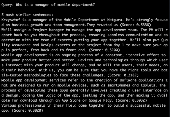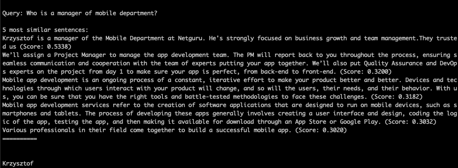 The initial sentence is precisely the information we are seeking. Indeed, Krzysztof is the manager. However, the algorithm also retrieved some other details about project managers and processes, but with significantly lower scores. We can easily modify the algorithm to only consider high scores by default.