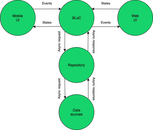 Since both mobile and web applications will behave in the same way and have the same states and events, they could share everything except the UI classes. Keeping that in mind, a diagram of a standard shared BLoC application might look like this: