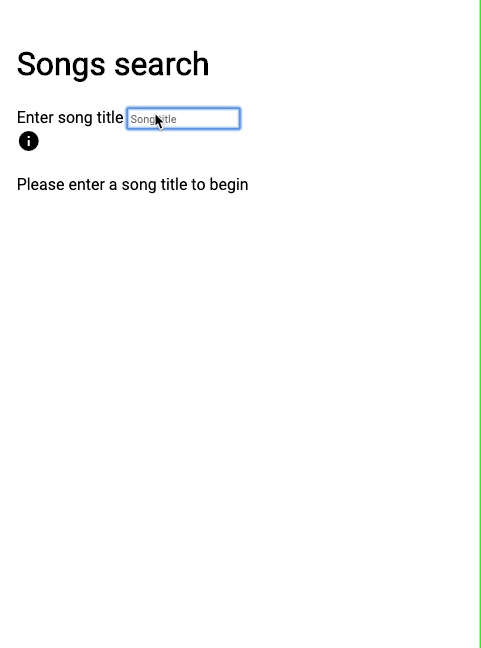 It looks similar to the mobile app version of this component. SongSearchBloC is injected into this class thanks to the @Input() annotation. Similarly to the mobile version, the method onTextChanged should be called each time the input in the search bar changes. The templateUrl property tells which view layout should be used for the creation of this component. The search bar HTML file looks like this: