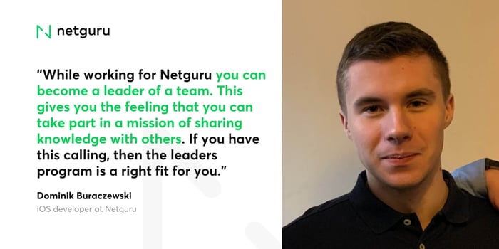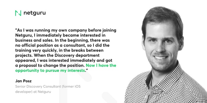 While at Netguru, developers have the scope to take their careers in any direction they wish. For example, there are examples of team members moving from React Native to the Flutter team or from iOS Developer to Discovery Consultant.