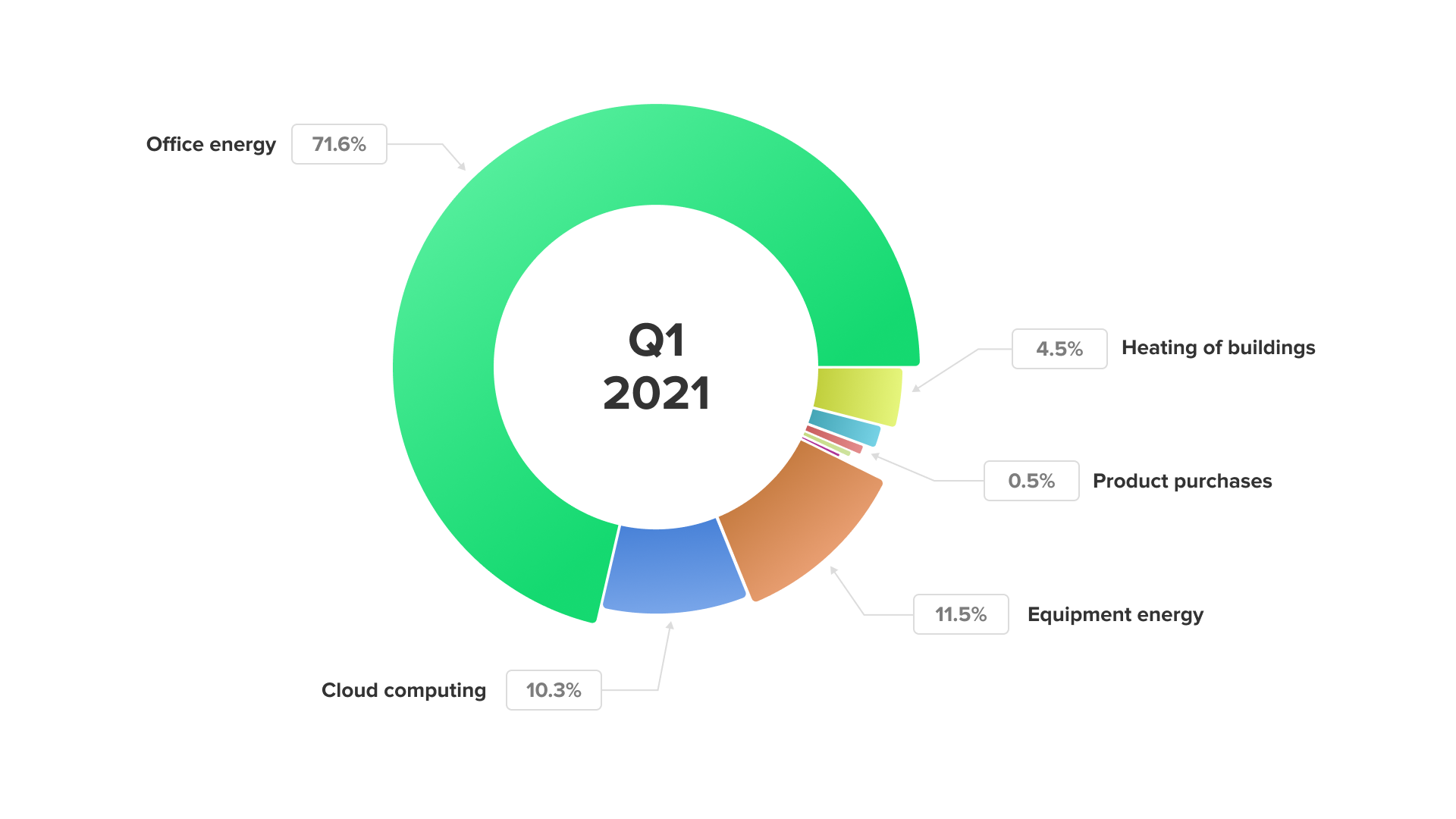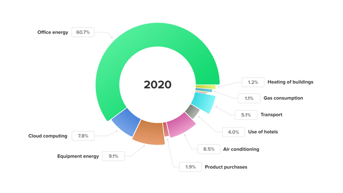 - Our main emission sources were: energy usage in the offices (61% for 2020 and 72% for 2021), power consumption of laptops and monitors (9% and 11%), cloud computing (8% and 10%).