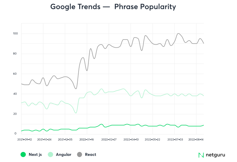 React became popular due to its flexibility, allowing developers to create scalable, simple, and fast frontend UIs for single-page web applications. According to a Google Trends survey, “React” is a highly searched phrase, along with “Next js” and “Angular”.