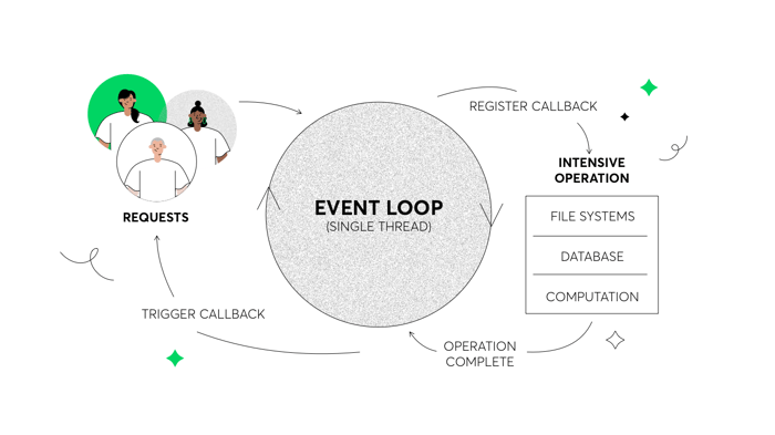 The avalanche of requests and data coming from IoT devices does not block Node.js web servers thanks to their event-driven architecture and asynchronous processing suitable for I/O-heavy operations on the IoT network. This makes Node.js fast as an application layer between these devices and databases used to store data originating from them.