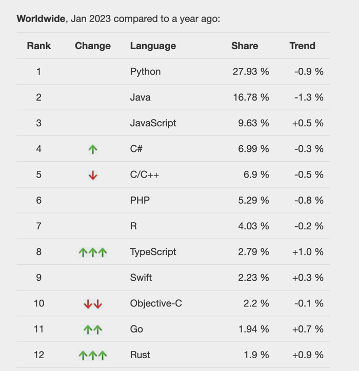 Looking at the TIOBE Index for January 2023 – an indicator of a programming language's popularity – Swift ranks at number 11, with Objective-C way down at 23. That being said, according to the PYPL PopularitY of Programming Language Index, Swift comes in at number nine, with Objective-C just one place below.