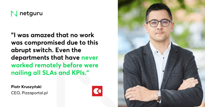 In PizzaPortal.pl, we switched to a completely remote mode of work mid-March. Some departments found this very smooth, as they had some flexibility before, for others it was more challenging, at least because of the existing infrastructure (dedicated to office work).
