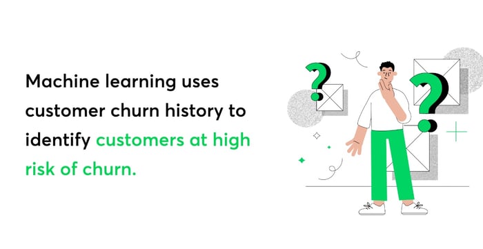 Machine learning uses customer churn history to identify customers at high risk of churn. The customer retention department then takes over to engage with those customers, for example, they might offer a gift or a promotion.