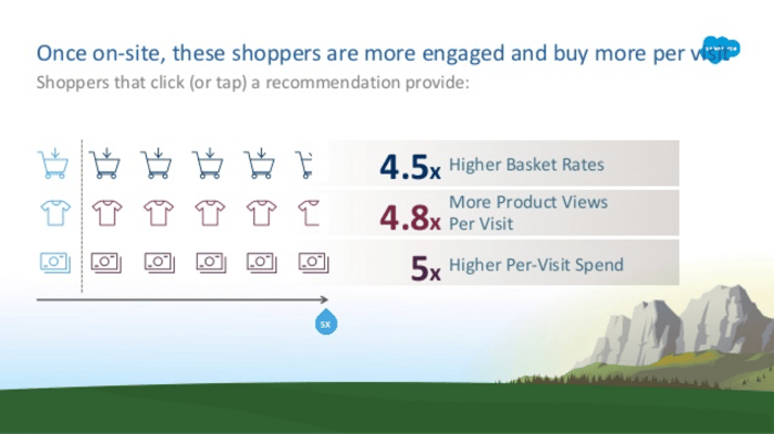 Recent Research from Monetate reveals that product recommendations can lead to a 70% increase in purchase rates, both in the initial session and in return sessions, and 33% higher average order values. A further study from Salesforce found that shoppers who click on product recommendations have 4.5x higher basket rates, make 4.8x more product views per visit, and have a 5x higher per-visit spend.